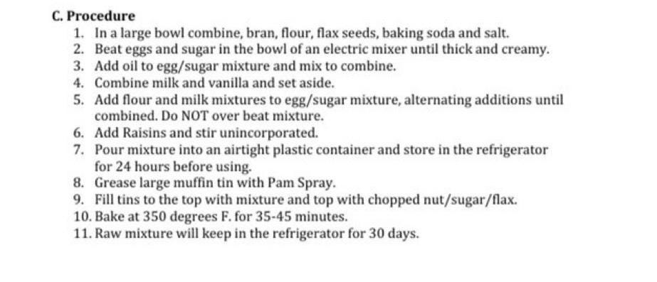 From another email: “Attached below are pictures of the muffin ingredients brands that should be used. No deviations please. The rest of the ingredients that are not on the pictures are not brand specific, but should meet the following criteria: - eggs and milk: always organic - olive oil: always extra virgin.”