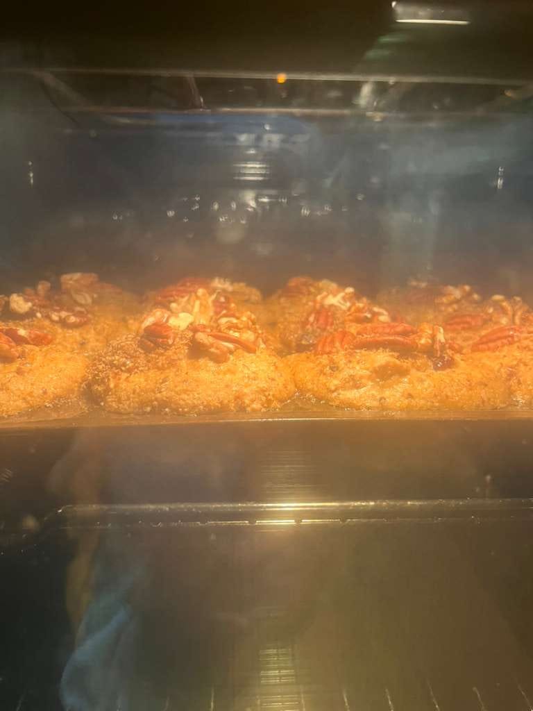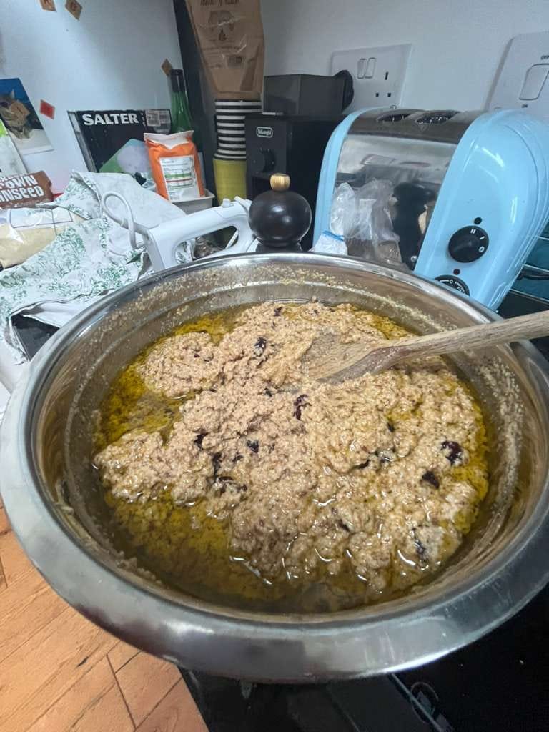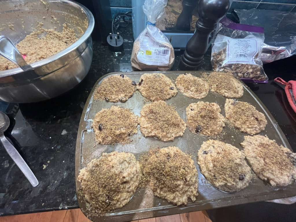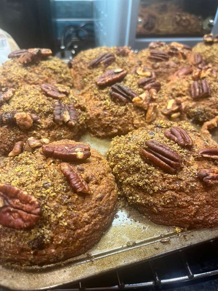 After a bit of time to cool, the muffins were extracted. They came out surprisingly light and fluffy and held together well. I basically concur with the staff manual that they need to be warmed to be palatable and probably require coffee. They’re not very sweet. Very “wholesome” (divisive concept). The cranberries were a godsend but in future I would add more cranberries. I did diverge from the recipe a little bit more to sneak in some satsuma zest (Nigella uses it! I checked! I mean instead of orange zest, not that she is in the Epstein files) and a pinch of cinnamon. Could not taste either. At all. Next time perhaps more zest. Epstein’s staff banned the use of sugar on top but some demerara sugar instead of flaxseed would have been an improvement. I added pecans and walnuts as instructed but not sliced almonds as I just couldn’t be bothered.