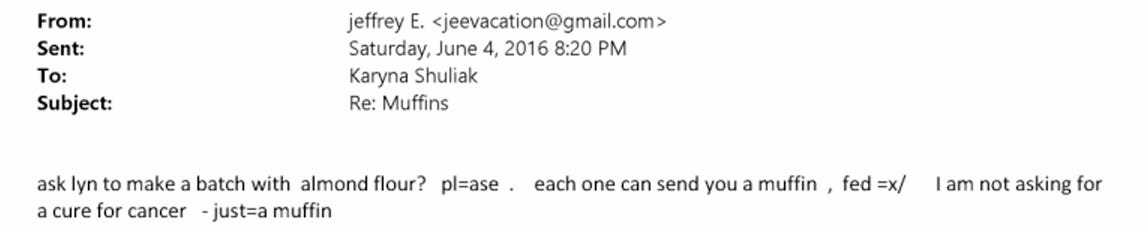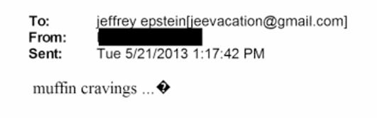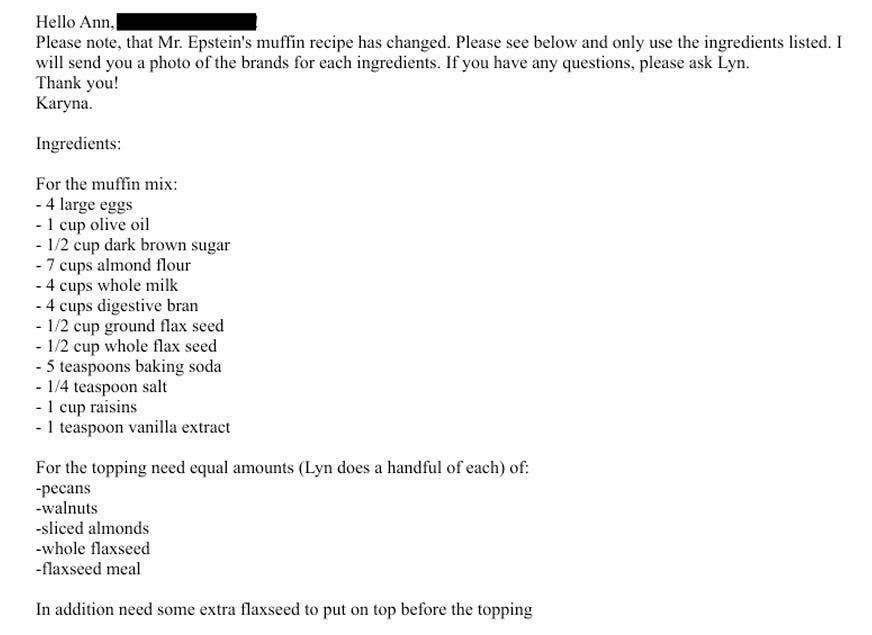 The muffins were so central to Epstein’s daily routine that they warrant their own page in his staff handbook; as seen in the emails, his staff ferry muffins and muffin batter worldwide. He is encouraged to eat a muffin when he gets out of prison in 2009.